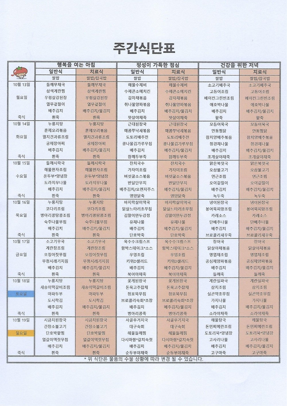 마산 더편한요양병원 #10월 둘째주식단표 페이지 정보 작성자 관리자 댓글 0건 조회 32회 작성일 25-10-13 09:59 목록 본문 안녕하세요 마산 더편한요양병원 주간식단표 알려드립니다^^*저희 더편한요양병원에서는 대학원 석사를 취득한 임상영양사가 건강하고 맛있는 식사를 제공하고 있습니다. 댓글 0 댓글목록 등록된 댓글이 없습니다.