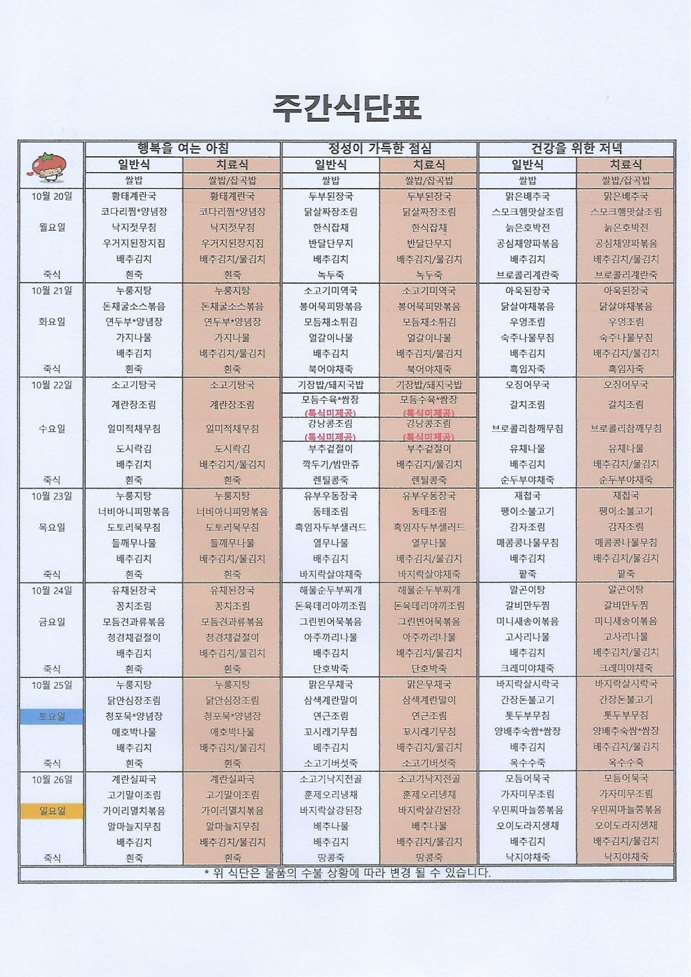 마산 더편한요양병원 #10월 셋째주식단표 페이지 정보 작성자 관리자 댓글 0건 조회 18회 작성일 25-10-20 09:52 목록 본문 안녕하세요 마산 더편한요양병원 주간식단표 알려드립니다^^*저희 더편한요양병원에서는 대학원 석사를 취득한 임상영양사가 건강하고 맛있는 식사를 제공하고 있습니다. 댓글 0 댓글목록 등록된 댓글이 없습니다.
