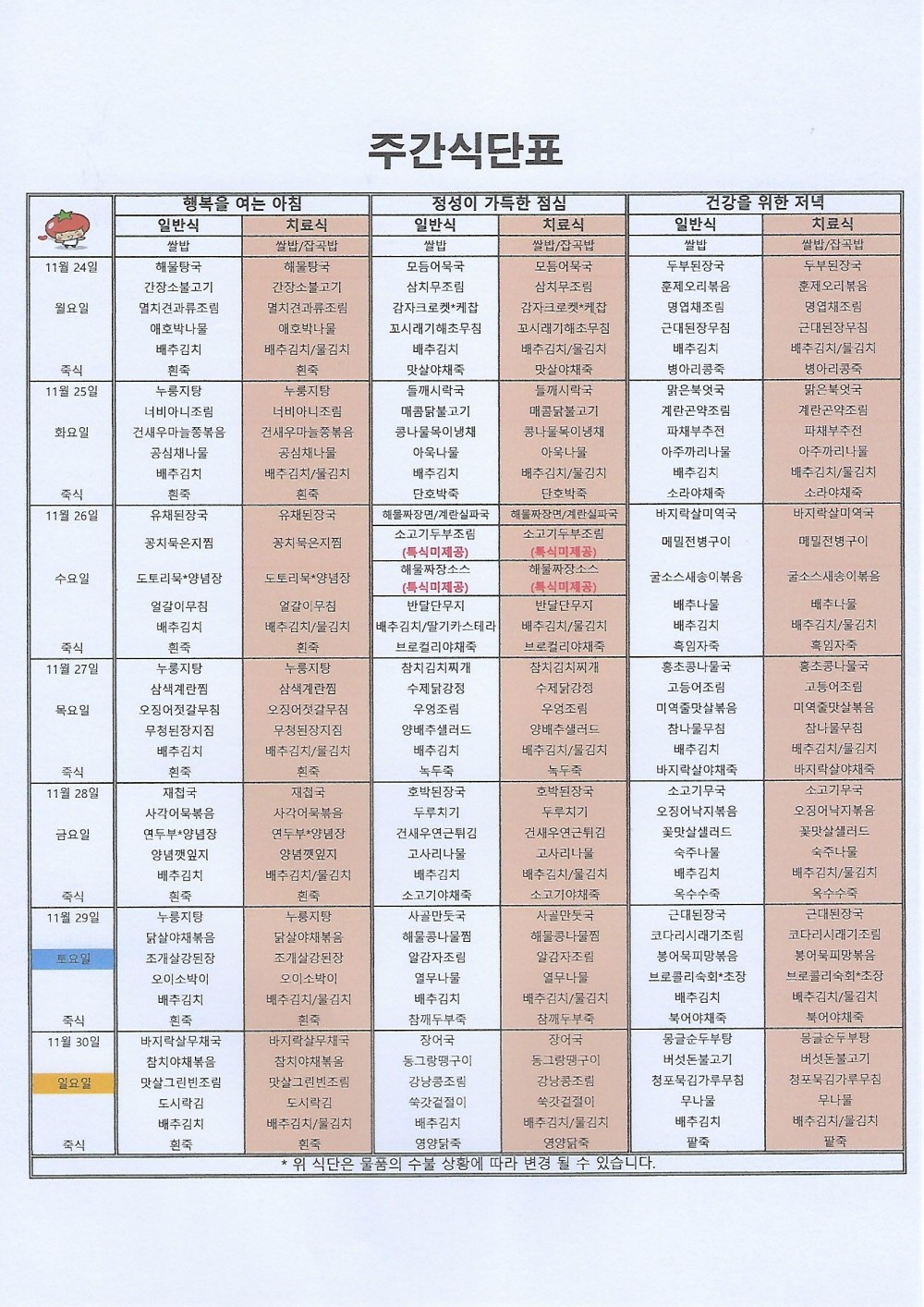 마산 더편한요양병원 #11월 넷째주식단표 페이지 정보 작성자 관리자 댓글 0건 조회 57회 작성일 25-11-24 10:00 목록 본문 안녕하세요 마산 더편한요양병원 주간식단표 알려드립니다^^*저희 더편한요양병원에서는 대학원 석사를 취득한 임상영양사가 건강하고 맛있는 식사를 제공하고 있습니다. 댓글 0 댓글목록 등록된 댓글이 없습니다.