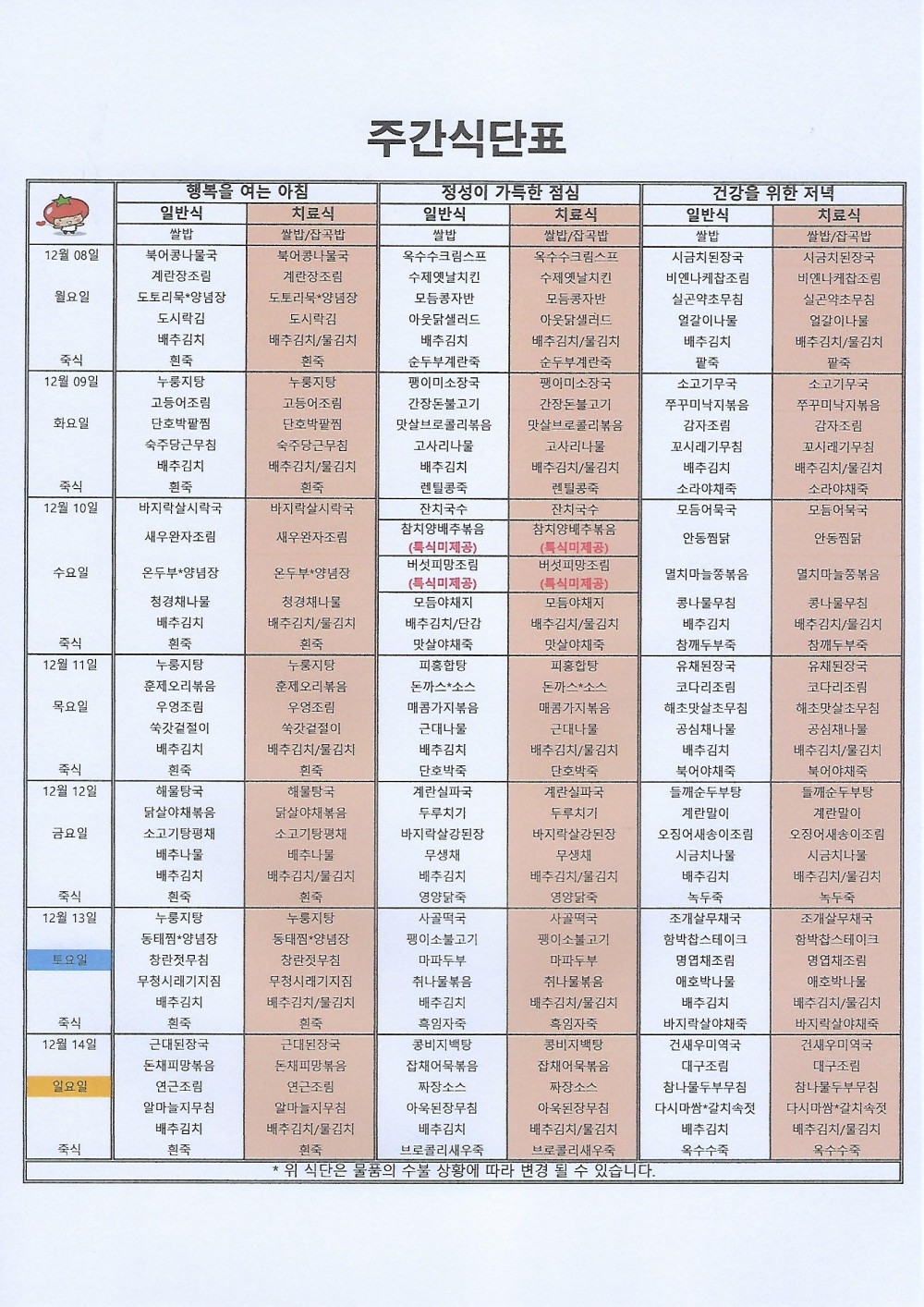 마산 더편한요양병원 #12월 둘째주식단표 페이지 정보 작성자 관리자 댓글 0건 조회 27회 작성일 25-12-08 09:00 목록 본문 안녕하세요 마산 더편한요양병원 주간식단표 알려드립니다^^*저희 더편한요양병원에서는 대학원 석사를 취득한 임상영양사가 건강하고 맛있는 식사를 제공하고 있습니다. 댓글 0 댓글목록 등록된 댓글이 없습니다.