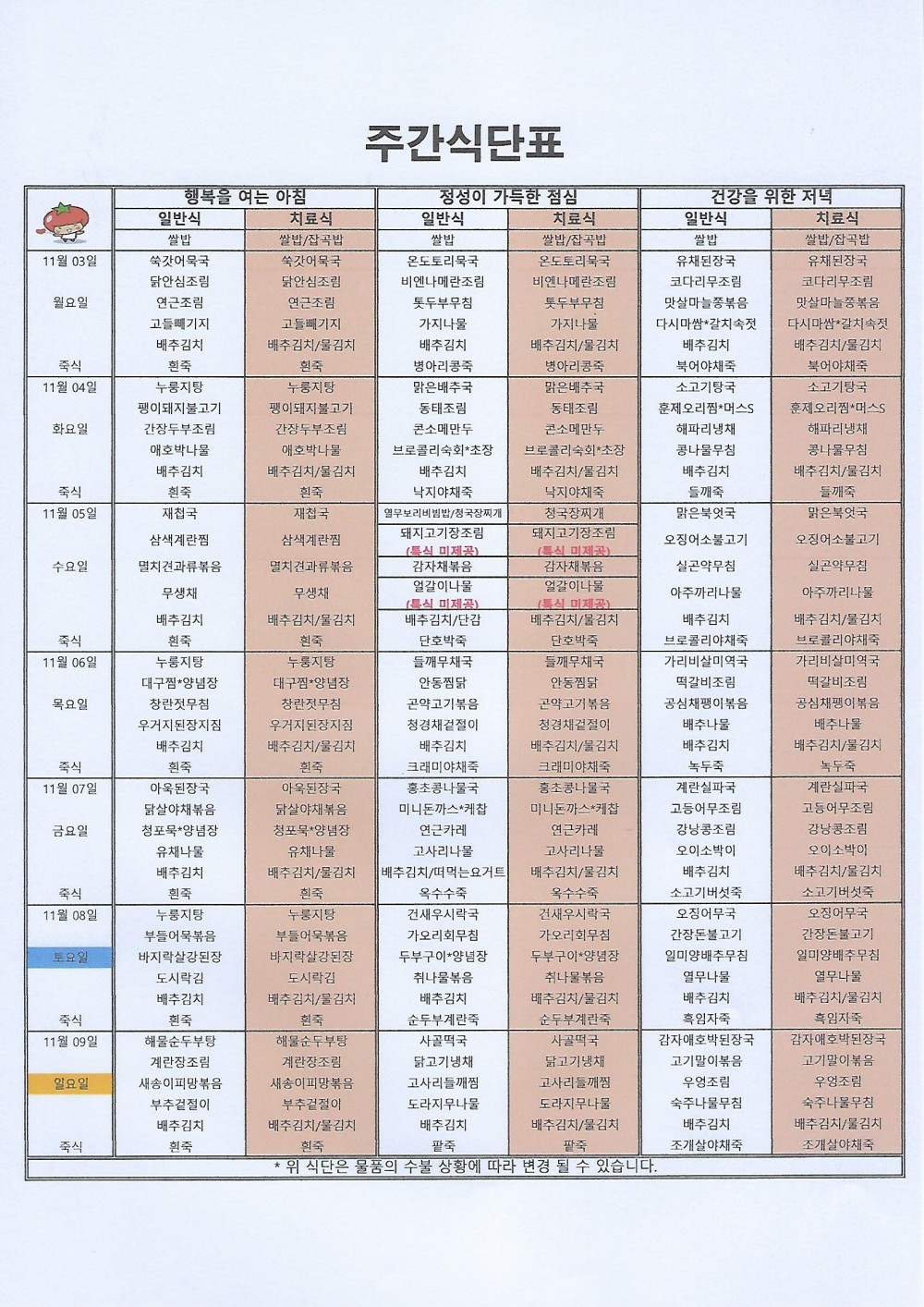 마산 더편한요양병원 #11월 첫째주식단표 페이지 정보 작성자 관리자 댓글 0건 조회 6회 작성일 25-11-03 10:11 목록 본문 안녕하세요 마산 더편한요양병원 주간식단표 알려드립니다^^*저희 더편한요양병원에서는 대학원 석사를 취득한 임상영양사가 건강하고 맛있는 식사를 제공하고 있습니다. 댓글 0 댓글목록 등록된 댓글이 없습니다.