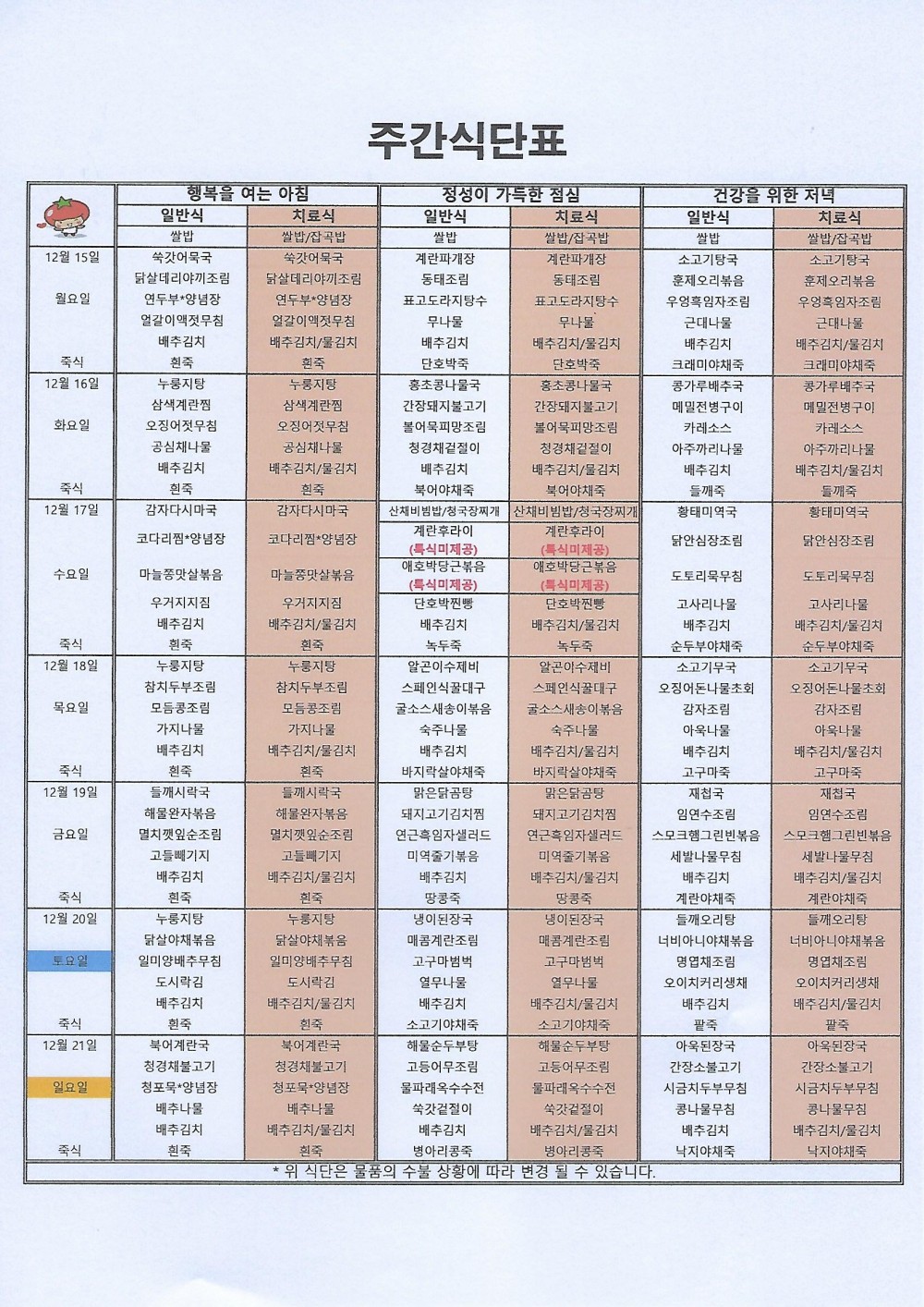 마산 더편한요양병원 #12월 셋째주식단표 페이지 정보 작성자 관리자 댓글 0건 조회 25회 작성일 25-12-15 10:44 목록 본문 안녕하세요 마산 더편한요양병원 주간식단표 알려드립니다^^*저희 더편한요양병원에서는 대학원 석사를 취득한 임상영양사가 건강하고 맛있는 식사를 제공하고 있습니다. 댓글 0 댓글목록 등록된 댓글이 없습니다.