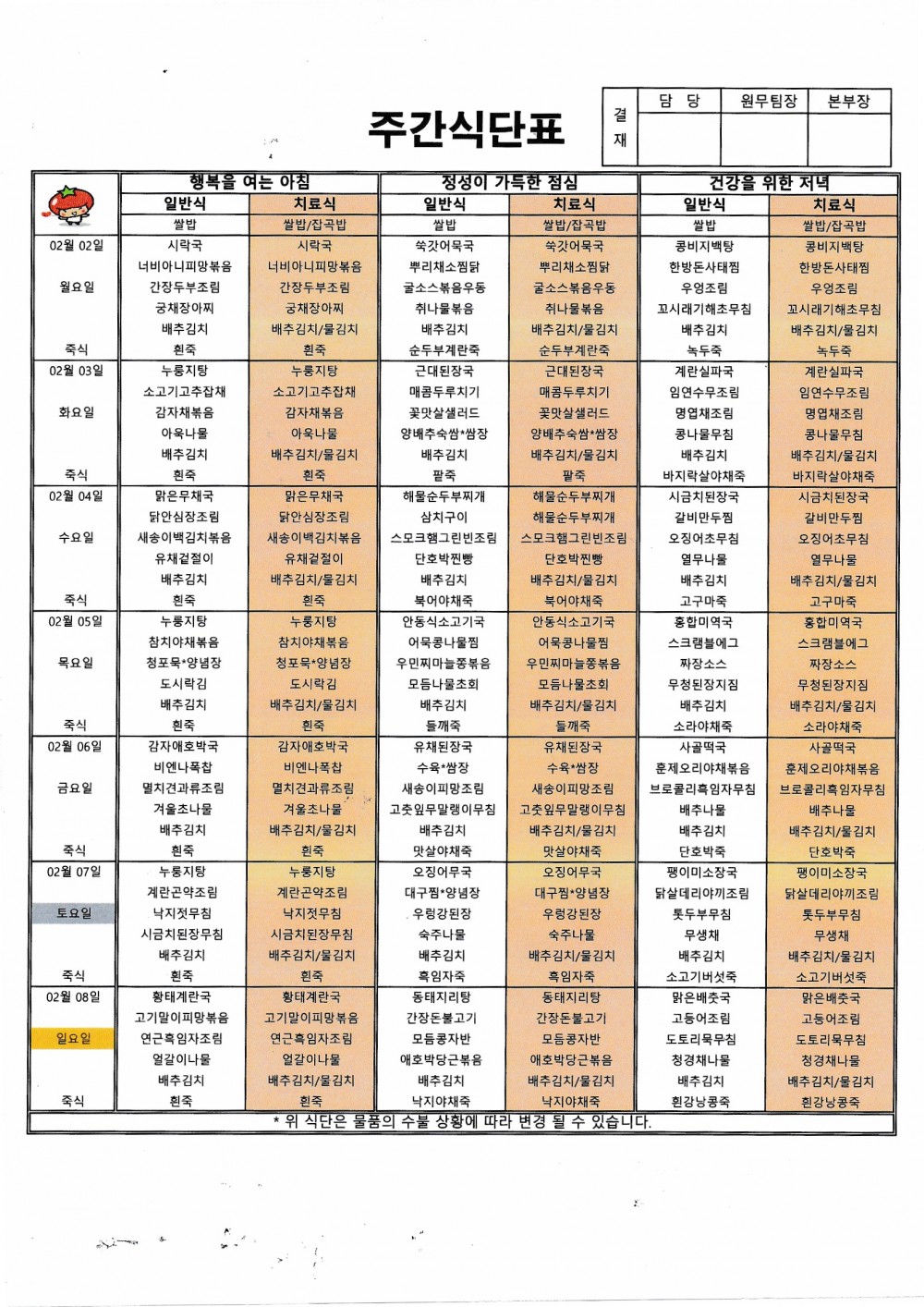 마산 더편한 요양병원 #2월 첫째주 식단표 페이지 정보 작성자 관리자 댓글 0건 조회 64회 작성일 26-02-02 10:09 목록 본문 안녕하세요 마산 더편한요양병원 주간식단표 알려드립니다^^ 댓글 0 댓글목록 등록된 댓글이 없습니다.