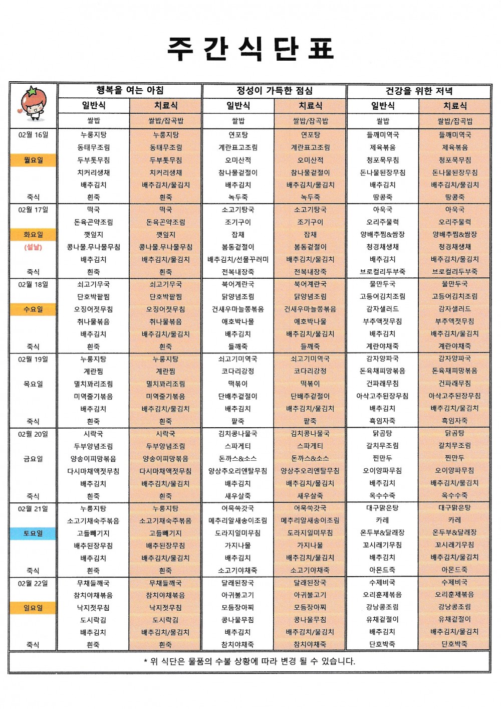 마산 더편한요양병원 #2월 셋째주 식단표 페이지 정보 작성자 관리자 댓글 0건 조회 41회 작성일 26-02-13 11:36 목록 본문 안녕하세요 마산 더편한요양병원 주간식단표 알려드립니다^^* 댓글 0 댓글목록 등록된 댓글이 없습니다.