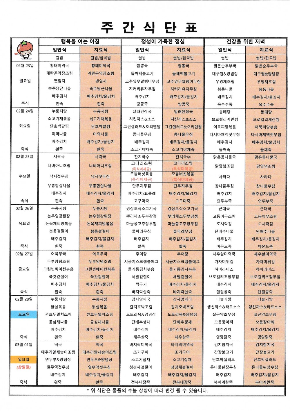 마산 더편한요양병원 #2월 넷째주식단표 페이지 정보 작성자 관리자 댓글 0건 조회 34회 작성일 26-02-23 10:21 목록 본문 안녕하세요 마산 더편한요양병원 주간식단표 알려드립니다^^ 댓글 0 댓글목록 등록된 댓글이 없습니다.
