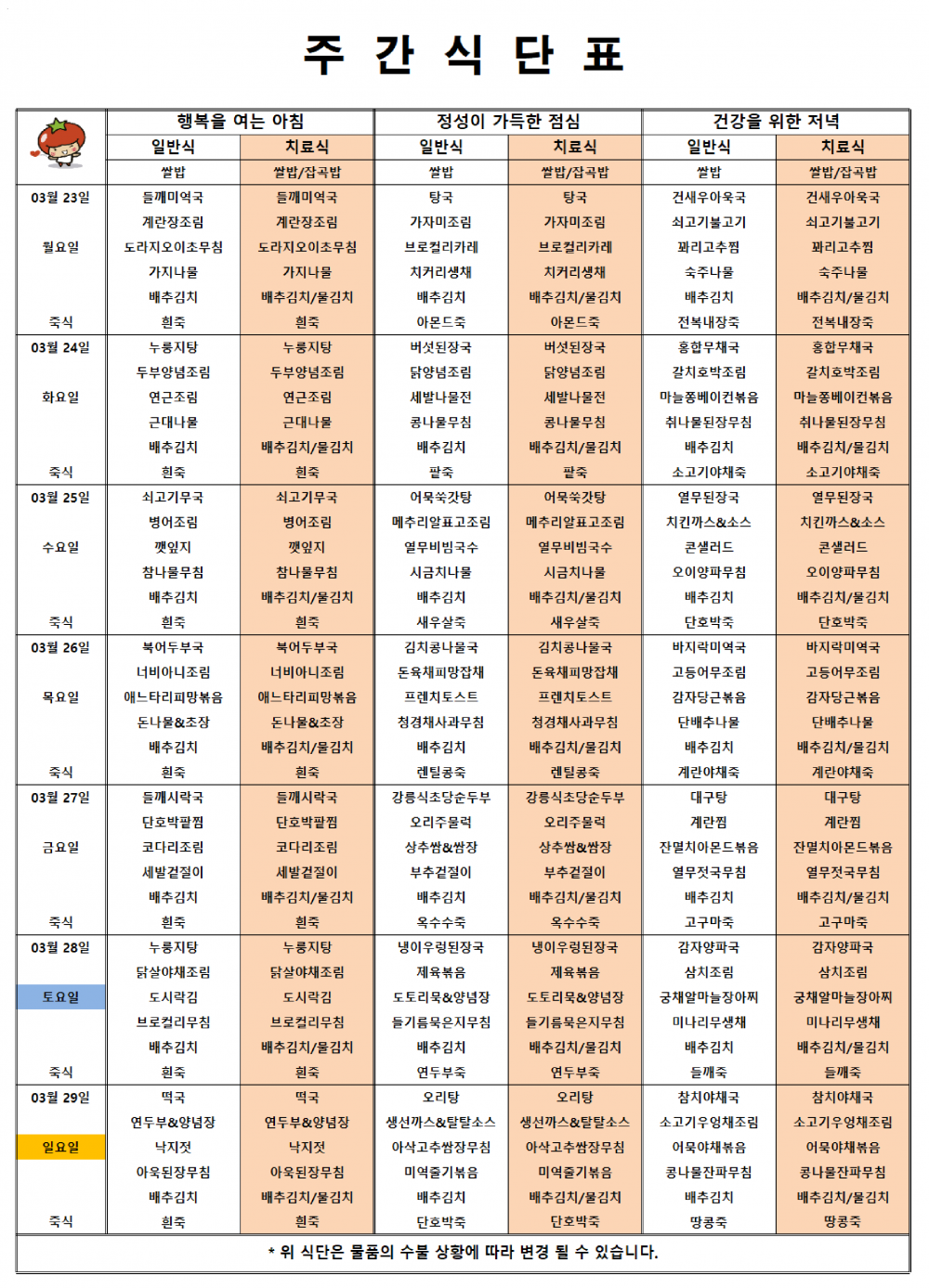 마산 더편한요양병원 #3월 넷째주 식단표 페이지 정보 작성자 관리자 댓글 0건 조회 49회 작성일 26-03-23 09:56 목록 본문 안녕하세요!!! 마산 더편한요양병원 주간식단표 알려드립니다^^ 댓글 0 댓글목록 등록된 댓글이 없습니다.