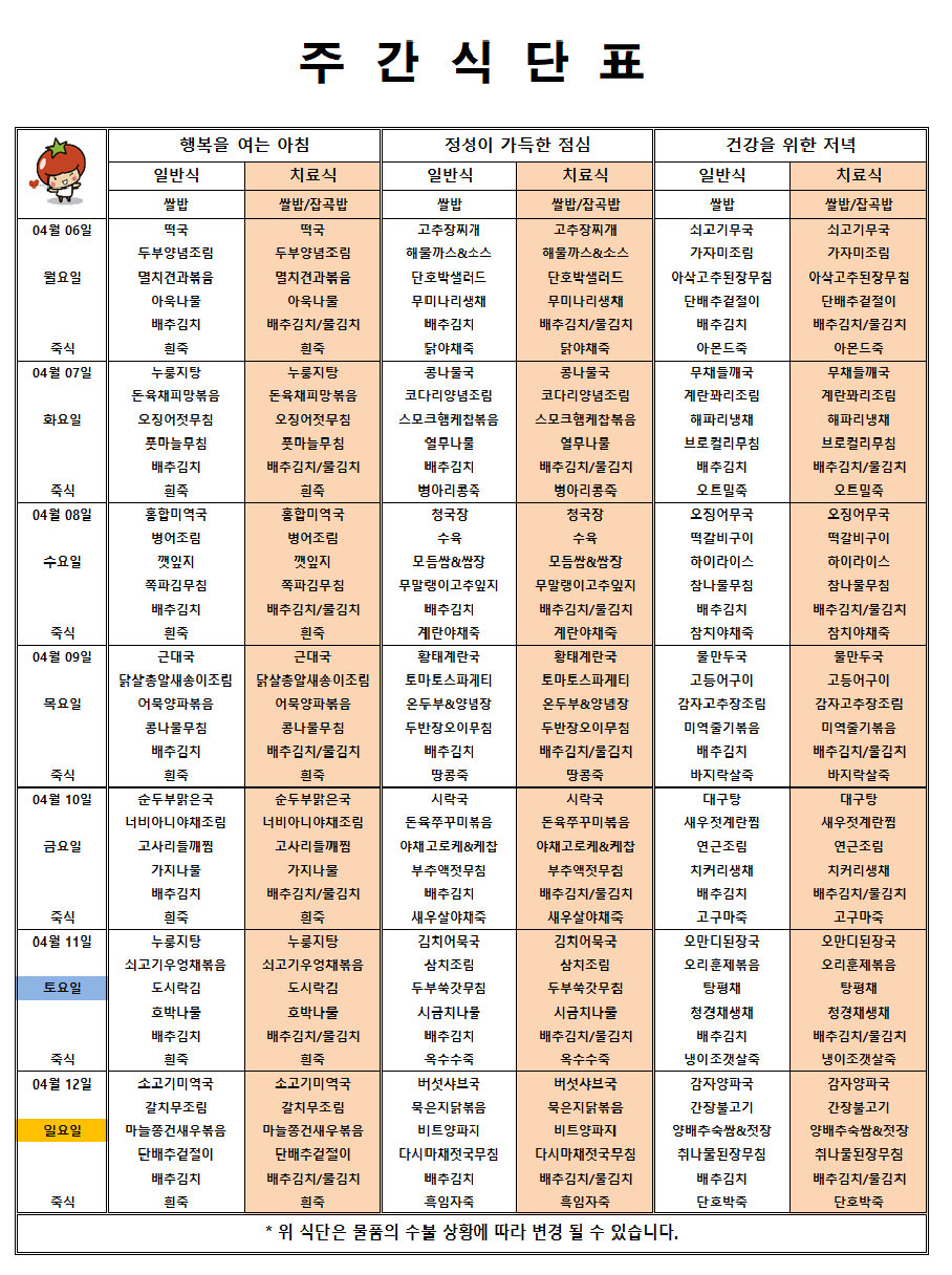 마산 더편한요양병원 #4월 둘째주 식단표 페이지 정보 작성자 관리자 댓글 0건 조회 25회 작성일 26-04-06 08:30 목록 본문 안녕하세요!!! 마산 더편한요양병원 주간식단표 알려드립니다^^ 댓글 0 댓글목록 등록된 댓글이 없습니다.