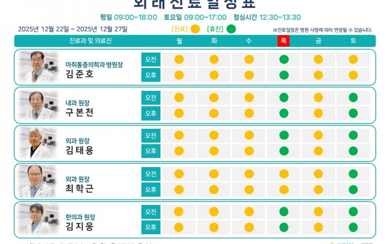 진료 일정은 병원 사정에 따라 변경 될 수 있습니다. 일요일은 휴진입니다.