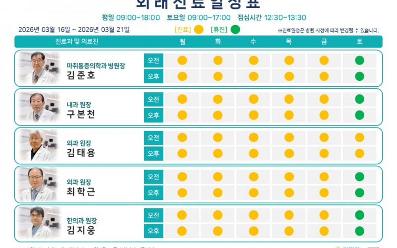 진료 일정은 병원 사정에 따라 변경 될 수 있습니다.일요일은 휴진입니다.*3/20(금) 마취통증의학과 : 김준호 병원장 휴..