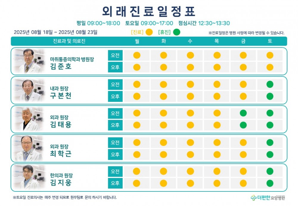 25년 8월 셋째 주 외래진료일정표 페이지 정보 작성자 관리자 댓글 0건 조회 69회 작성일 25-08-04 16:43 목록 본문 *8/22 (금) 외과(김태용 원장) 휴진입니다.진료 일정은 병원 사정에 따라 변경 될 수 있습니다.일요일은 휴진입니다. 댓글 0 댓글목록 등록된 댓글이 없습니다.