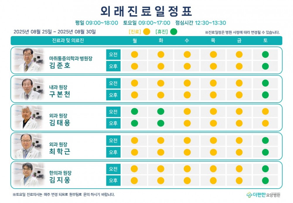 25년 8월 넷째 주 외래진료일정표 페이지 정보 작성자 관리자 댓글 0건 조회 86회 작성일 25-08-04 16:44 목록 본문 *8/25(월) ~ 8/26(화) 외과(김태용 원장) 휴진입니다.진료 일정은 병원 사정에 따라 변경 될 수 있습니다.일요일은 휴진입니다. 댓글 0 댓글목록 등록된 댓글이 없습니다.