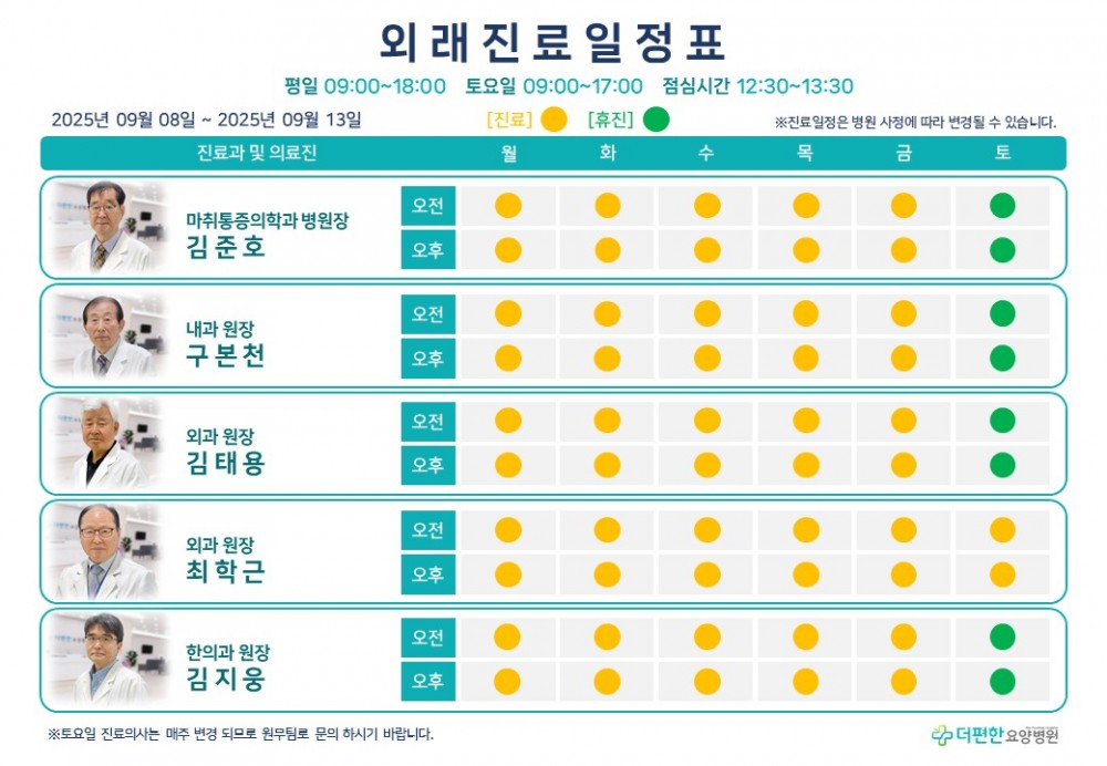 25년 9월 둘째 주 외래진료일정표 페이지 정보 작성자 관리자 댓글 0건 조회 18회 작성일 25-09-01 11:01 목록 본문 진료 일정은 병원 사정에 따라 변경 될 수 있습니다.일요일은 휴진입니다. 댓글 0 댓글목록 등록된 댓글이 없습니다.