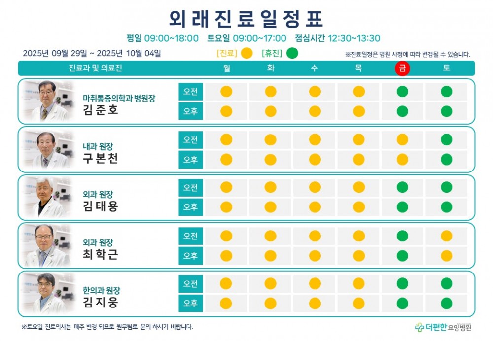 25년 10월 첫째 주 외래진료일정표 페이지 정보 작성자 관리자 댓글 0건 조회 7회 작성일 25-10-01 11:17 목록 본문 진료 일정은 병원 사정에 따라 변경 될 수 있습니다.일요일은 휴진입니다. 댓글 0 댓글목록 등록된 댓글이 없습니다.