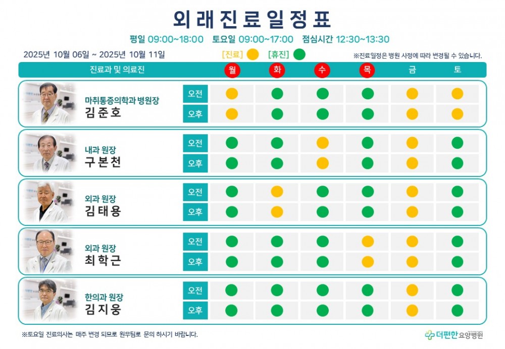 25년 10월 둘째 주 외래진료일정표 페이지 정보 작성자 관리자 댓글 0건 조회 3회 작성일 25-10-01 11:18 목록 본문 진료 일정은 병원 사정에 따라 변경 될 수 있습니다.일요일은 휴진입니다. 댓글 0 댓글목록 등록된 댓글이 없습니다.