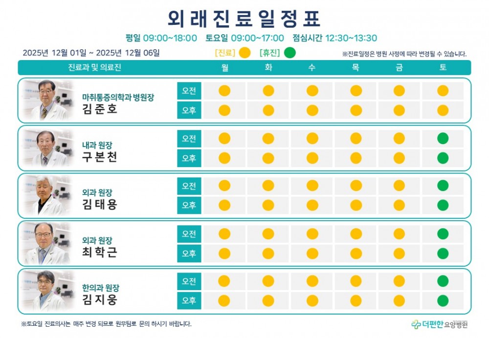 25년 12월 첫째 주 외래진료일정표 페이지 정보 작성자 관리자 댓글 0건 조회 24회 작성일 25-12-01 11:21 목록 본문 진료 일정은 병원 사정에 따라 변경 될 수 있습니다. 일요일은 휴진입니다. 댓글 0 댓글목록 등록된 댓글이 없습니다.
