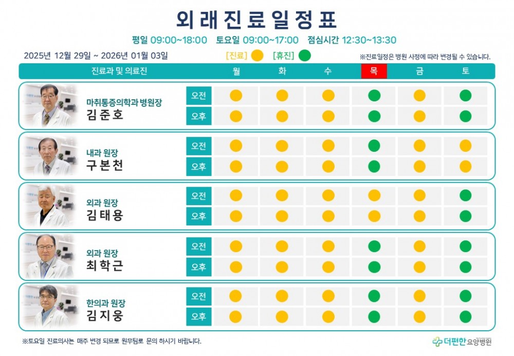 25년 12월 다섯째 주 외래진료일정표 페이지 정보 작성자 관리자 댓글 0건 조회 42회 작성일 25-12-29 10:02 목록 본문 *12/30(화) ~ 12/31(수) 내과 : 구본천 원장 휴진진료 일정은 병원 사정에 따라 변경 될 수 있습니다.일요일은 휴진입니다. 댓글 0 댓글목록 등록된 댓글이 없습니다.