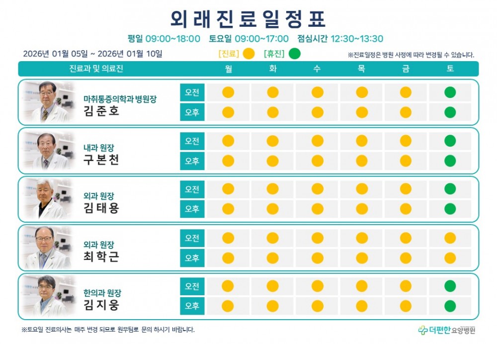 26년 1월 첫째 주 외래진료일정표 페이지 정보 작성자 관리자 댓글 0건 조회 37회 작성일 26-01-05 15:40 목록 본문 진료 일정은 병원 사정에 따라 변경 될 수 있습니다.일요일은 휴진입니다. 댓글 0 댓글목록 등록된 댓글이 없습니다.