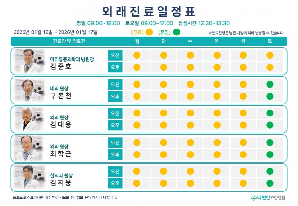 26년 1월 둘째 주 외래진료일정표 페이지 정보 작성자 관리자 댓글 0건 조회 36회 작성일 26-01-05 15:43 목록 본문 진료 일정은 병원 사정에 따라 변경 될 수 있습니다.일요일은 휴진입니다. 댓글 0 댓글목록 등록된 댓글이 없습니다.