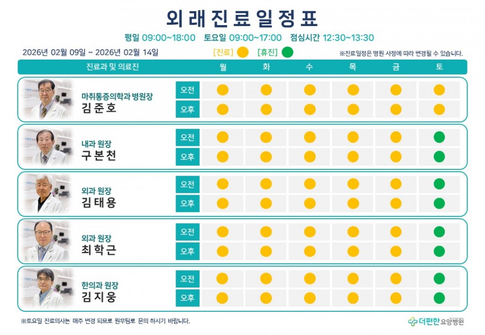 26년 2월 둘째 주 외래진료일정표 페이지 정보 작성자 관리자 댓글 0건 조회 25회 작성일 26-01-30 15:42 목록 본문 진료 일정은 병원 사정에 따라 변경 될 수 있습니다.일요일은 휴진입니다. 댓글 0 댓글목록 등록된 댓글이 없습니다.